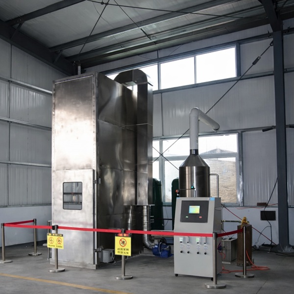 4、先进的燃烧烟雾的收集和洗涤烟尘装置:采用SUS304不锈钢,直径为800mm高度为3500mm。烟雾收集塔分为三部分:喷淋