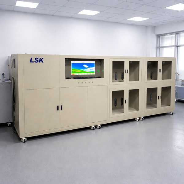 净水器整机寿命测试台用于检测净水器电器耐久寿命和阀门管路耐久寿命, 净水器整机寿命测试台实现能效参数检测并记录相关数值。每个工位实时显示并记录被测试样机的供水水压、出水温度、电压、电流、功率、进水、纯水、废水流量及进水、纯水电导率值。采用PLC电脑人机界面控制,可对测试参数进行自己记录和保存。