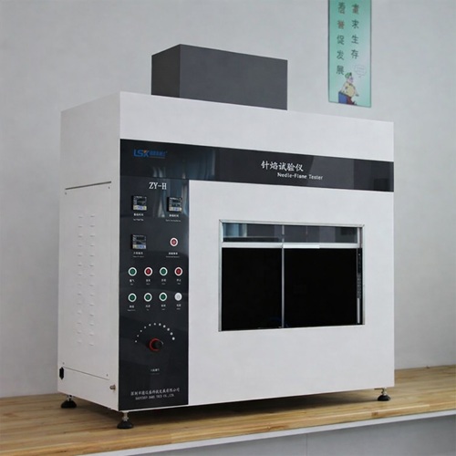2、针焰试验仪是用规定尺寸 (Φ0.9mm ) 的针状燃烧器,通以特定燃气 ( 丁烷 ) ,以 45°角定时定向施燃试品,视试品是否引燃及持燃时间和燃烧长度来评定设备内部因故障条件造成的小火焰的着火危险性。