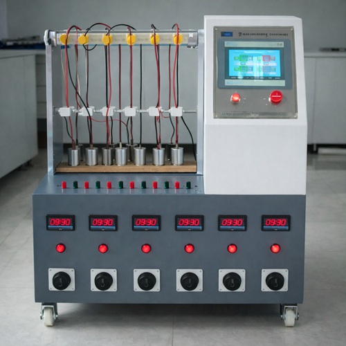 电源线弯曲摇摆试验机符合UL817、CSA22.2、IEC884-1、CCC、GB2099.1、VDE、SAA标准,专门测试插头引出线及电线之耐折强度。试法是将试料固定在夹具上,并加一定荷重,试验时夹具左右摆动,经一定次数后,检视其断线率;或至无法通电时,查看其总计摆动次数。本机能自动计数,试料弯折至无法通电时,并自动停止操作。