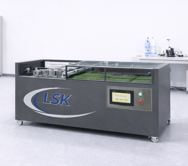 人造草坪耐磨损试验机通过LSK-YD05测试设备上的钉辊在人造草坪样品上来回碾压,模拟正常使用时,运动员穿着带钉运动鞋在草坪上运动,达到一定的时间周期后,检验、评价草坪的磨损情况。