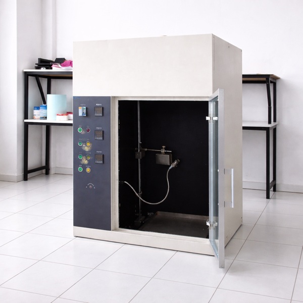 热燃油试验是IEC 60950-1:2000、GB4943-2001《信息技术设备的安全》等标准规定的仿真安全试验项目。是将10mL规定性能(38MJ/L 0.845g/mL~0.865g/mL)的燃油,加热至燃烧1mim后,按一定的高度(100mm)和一定的流量(1mL/s)全部平稳地倒在试品(防火防护外壳)的开孔中央,以是否点燃试品下规定距离(50mm)和规定密度(40g/m2)的引燃铺垫物来对试品的防火防护性能进行评定。